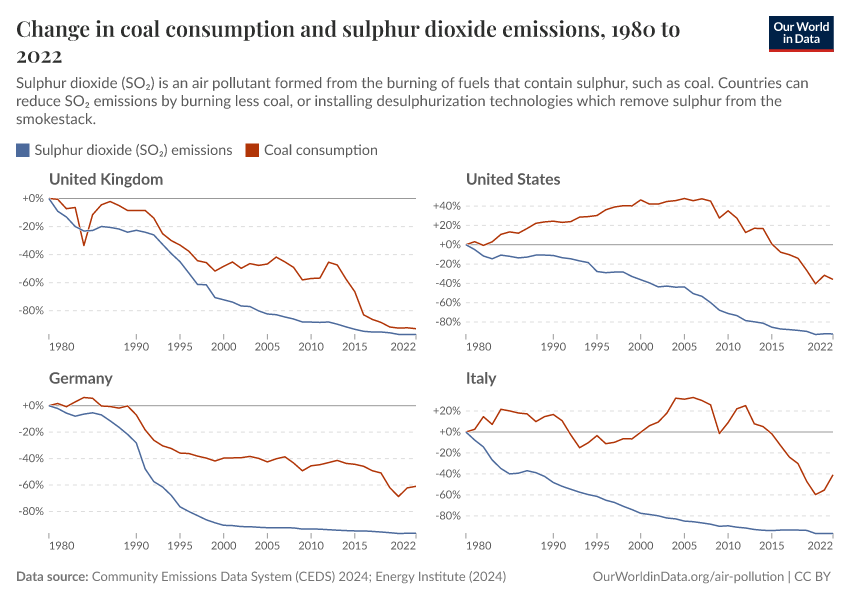 The United Kingdom did a mix of both. Its coal burning has fallen rapidly since the 1960s. Look at the two charts below: by 2022, coal consumption had fallen by 96% and sulfur dioxide emissions by more than 99%.