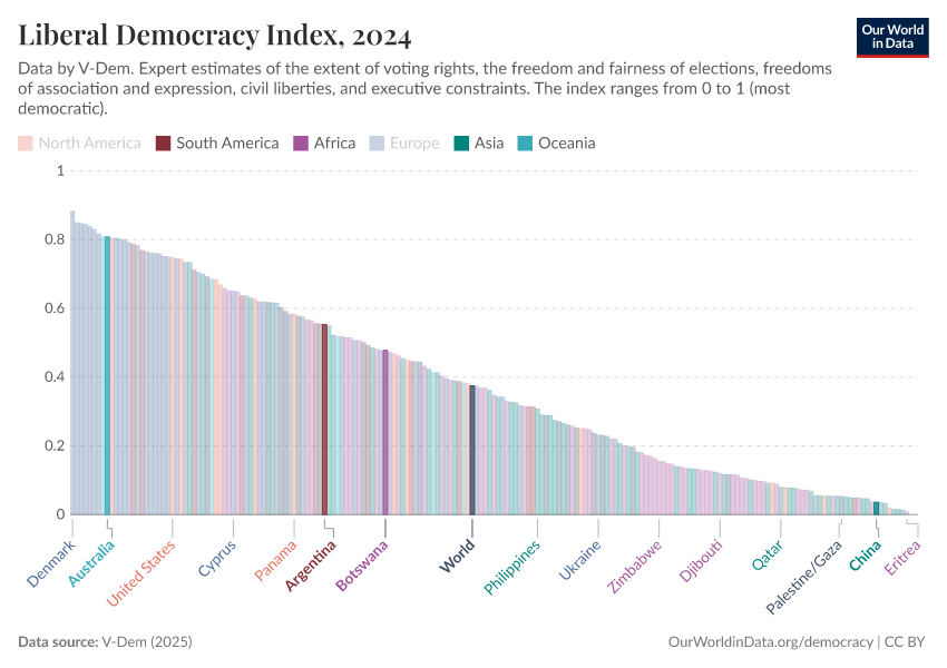 Bastian Herre (2022) - “People around the world have gained democratic rights, but some have many more rights than others” Published online at OurWorldinData.org. Retrieved from: 'https://data-lexicalindex-indicators.owid.pages.dev:8789/20260119-070102/democratic-world.html' [Online Resource] (archived on January 19, 2026).BibTeX citation