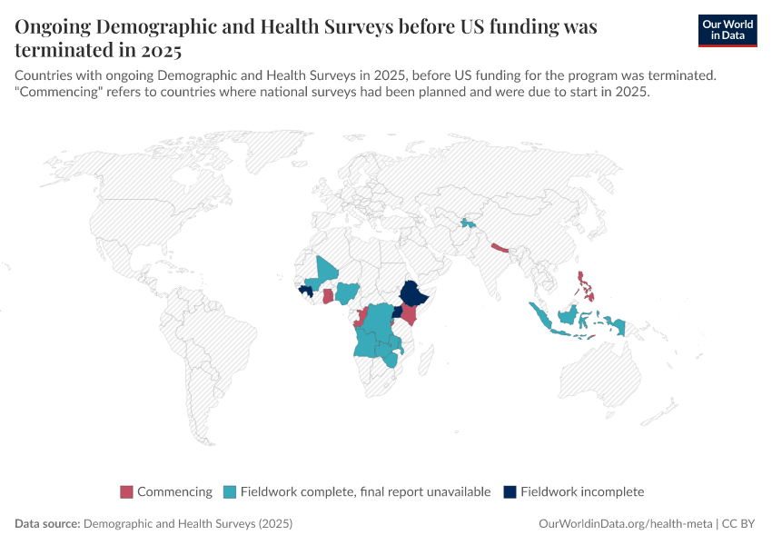 It was primarily funded by the United States Agency for International Development (USAID) and run by the American company ICF International. But earlier this year, the US government announced that it had terminated funding for the program. This threatens global health and development efforts and will affect many of the estimates we provide on Our World in Data.