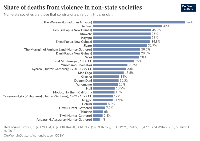 Max Roser (2013) - “Data review: ethnographic and archaeological evidence on violent deaths” Published online at OurWorldinData.org. Retrieved from: 'https://data-lexicalindex-indicators.owid.pages.dev:8789/20251125-173858/ethnographic-and-archaeological-evidence-on-violent-deaths.html' [Online Resource] (archived on November 25, 2025).BibTeX citation
