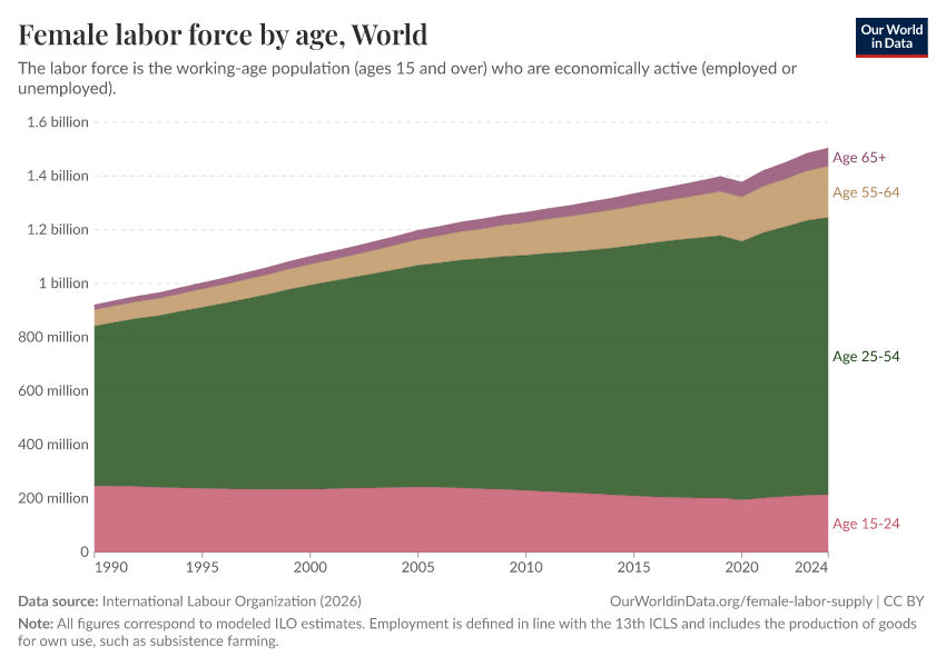 As we can see, today the number of women in the global labor force who are younger than 25 is slightly less than what it was in the year 2000. However, the global female labor force grew by almost 40% over the same period.