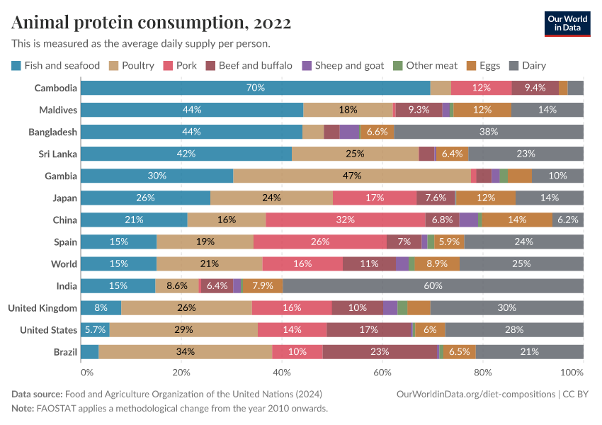 In some countries, seafood dominates. It accounts for the majority of animal protein in Cambodia, Bangladesh, and the Maldives.