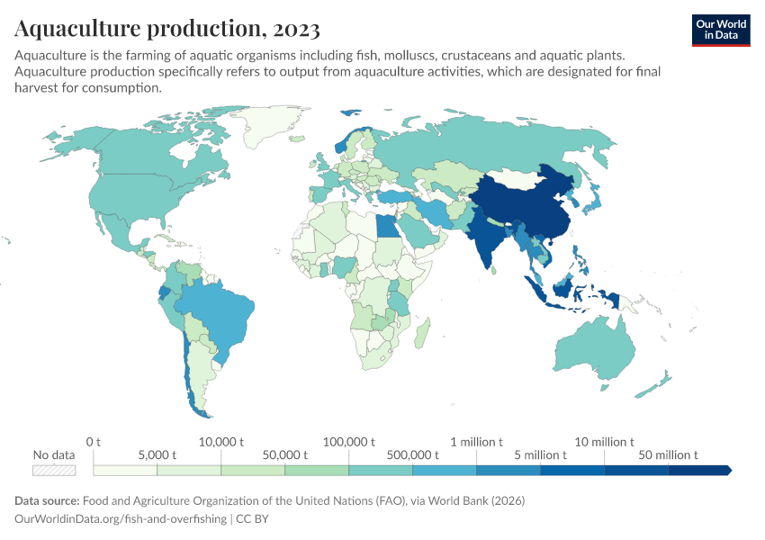 The two charts here show the distribution of fish farming (also known as ‘aquaculture’) by country. First is the global distribution, as shown on the map. Second, as in the regional breakdown, you can also add and compare countries using the “Edit countries and regions” button.