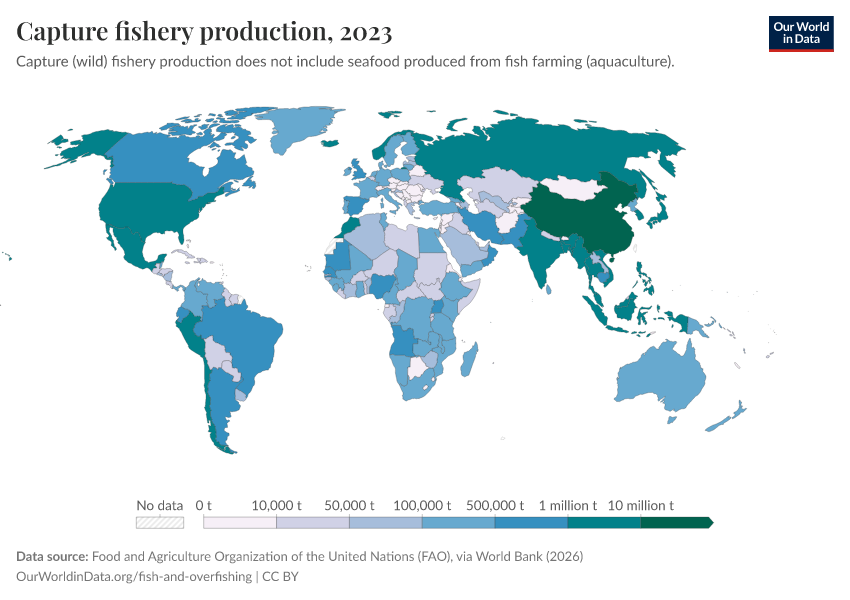 The chart here shows the distribution of wild fish catch by country. This is total seafood production minus aquaculture (fish farming).