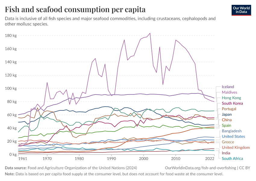 In the charts here, we see the average per capita consumption of fish and seafood across the world.6 The highest seafood consumers are countries including Iceland, the Maldives, and Hong Kong. Contrast that with those at the bottom of the table: landlocked countries such as Mongolia, Afghanistan, and Niger understandably eat relatively little fish.