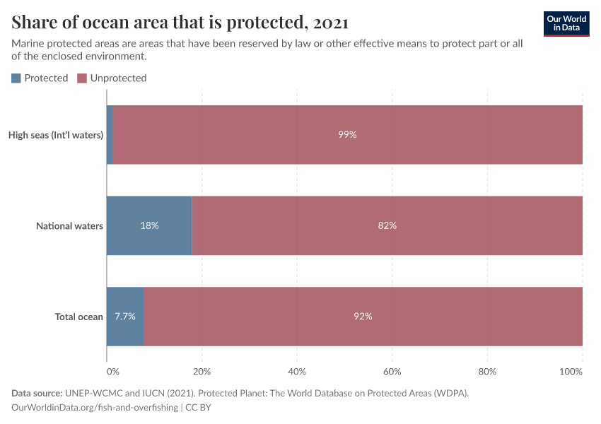 Here, we have to differentiate between national territorial waters – that is, parts of the ocean typically closer to coastlines that countries have national rights over – and international waters (also called the ‘high seas’) that do not belong to any single country. In the chart, we see the amount in each zone that is protected and unprotected.41