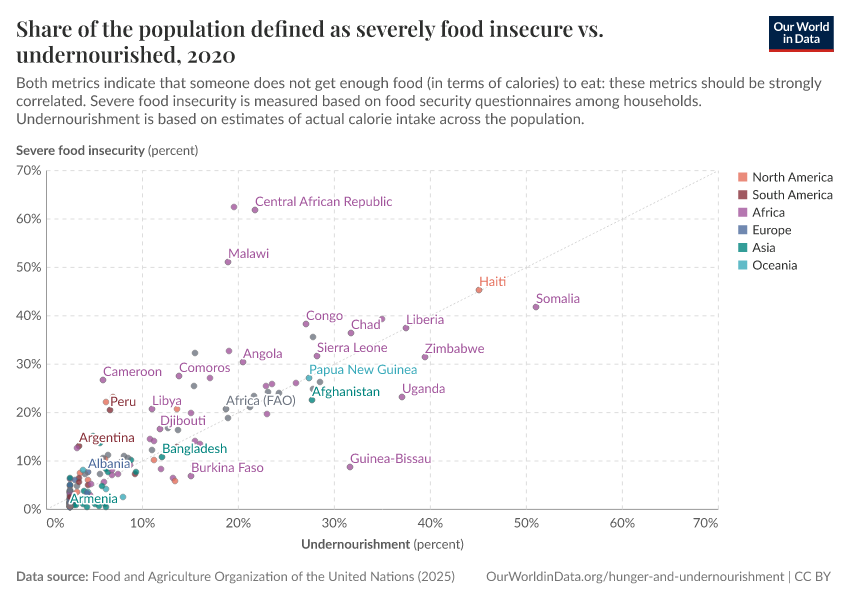 In the chart below we see the correlation between these two metrics: on the y-axis we have the prevalence of severe food insecurity, and on the x-axis we have the prevalence of undernourishment. If these estimates were identical, they’d lie along the diagonal gray line.