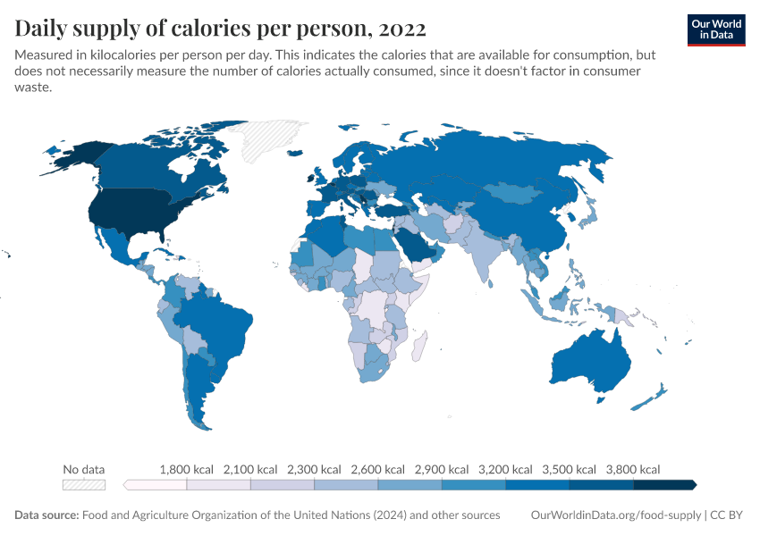 Max Roser, Hannah Ritchie, and Pablo Rosado (2013) - “Food Supply” Published online at OurWorldinData.org. Retrieved from: 'https://data-lexicalindex-indicators.owid.pages.dev/food-supply' [Online Resource]BibTeX citation
