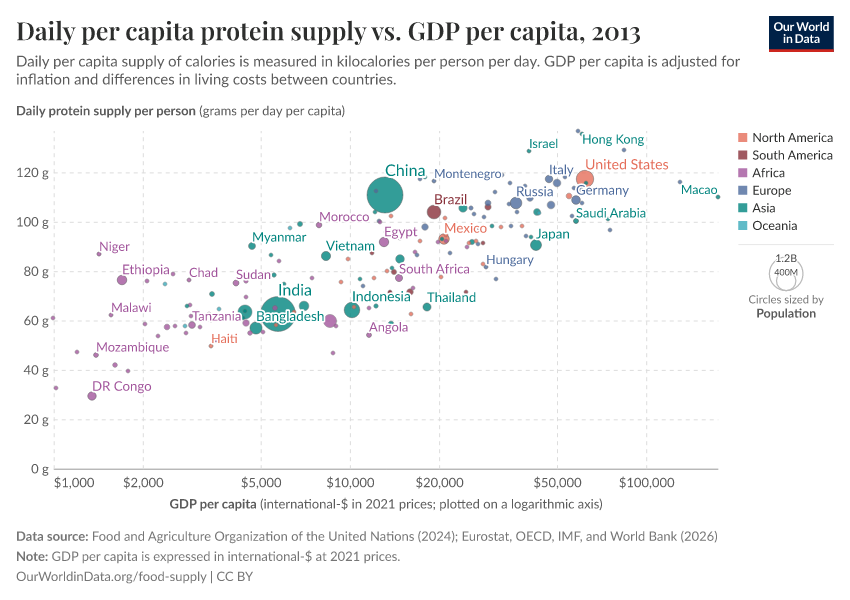 In the sub-sections below we have plotted the relationship between daily per capita food supply (in the form of calories, protein, and then fat) versus gross domestic product (GDP) per capita in 2011 international-$. Several countries selected across a range of income levels and global regions have been highlighted for comparison. For all three measures of food supply, we see a close correlation between per capita supply and prosperity. As we get richer, per capita supply tends to increase.