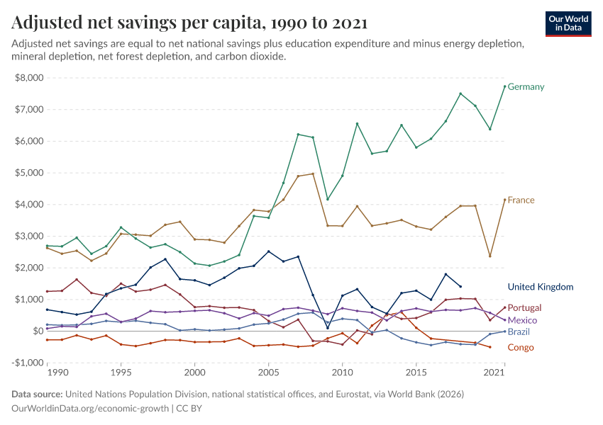“Data Page: Adjusted net savings per capita”. Our World in Data (2026). Data adapted from United Nations Population Division, national statistical offices, and Eurostat, via World Bank. Retrieved from https://data-lexicalindex-indicators.owid.pages.dev:8789/20260202-181317/grapher/adjusted-net-savings-per-person.html [online resource] (archived on February 2, 2026).How to cite this data