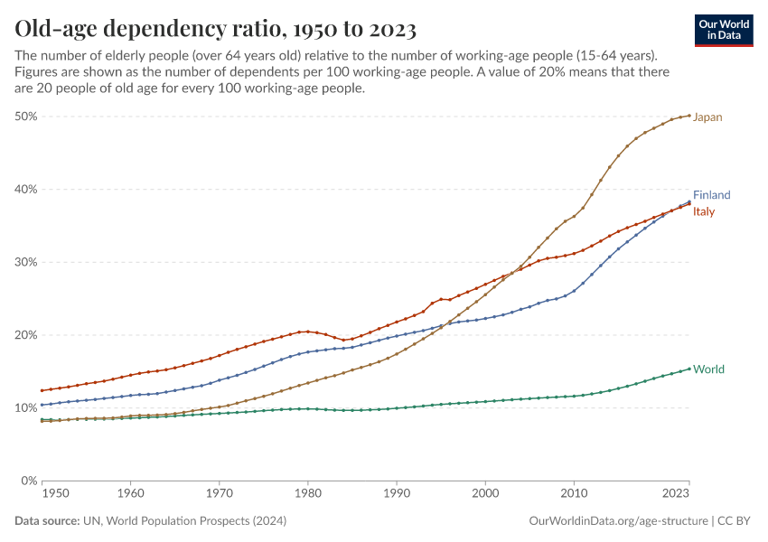 “Data Page: Old-age dependency ratio, age old”. Our World in Data (2026). Data adapted from United Nations. Retrieved from https://data-lexicalindex-indicators.owid.pages.dev:8789/20250929-103213/grapher/age-dependency-ratio-old.html [online resource] (archived on September 29, 2025).How to cite this data