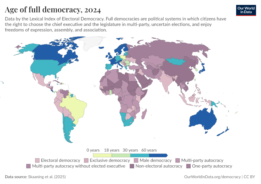 Skaaning et al. (2025) – processed by Our World in Data. “Age of full democracy” [dataset]. Skaaning et al., “Lexical Index of Electoral Democracy (LIED) v6.8” [original data]. Retrieved February 9, 2026 from https://data-lexicalindex-indicators.owid.pages.dev:8789/20260119-065148/grapher/age-of-full-democracy.html (archived on January 19, 2026).