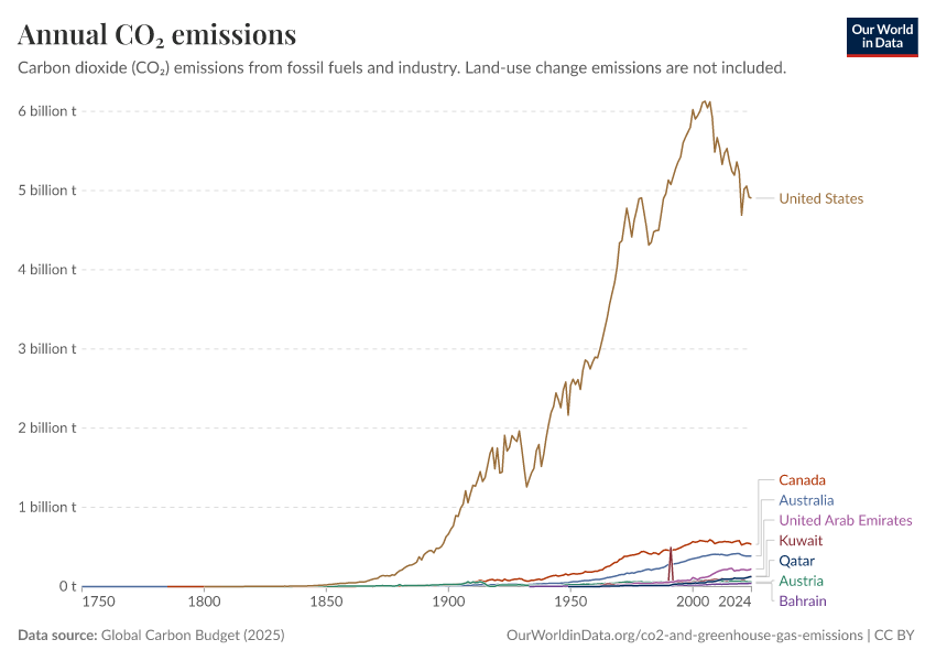 Global Carbon Budget (2025) – with major processing by Our World in Data. “Annual CO₂ emissions” [dataset]. Global Carbon Project, “Global Carbon Budget v15” [original data]. Retrieved February 9, 2026 from https://data-lexicalindex-indicators.owid.pages.dev:8789/20260119-070102/grapher/annual-co2-emissions-per-country.html (archived on January 19, 2026).