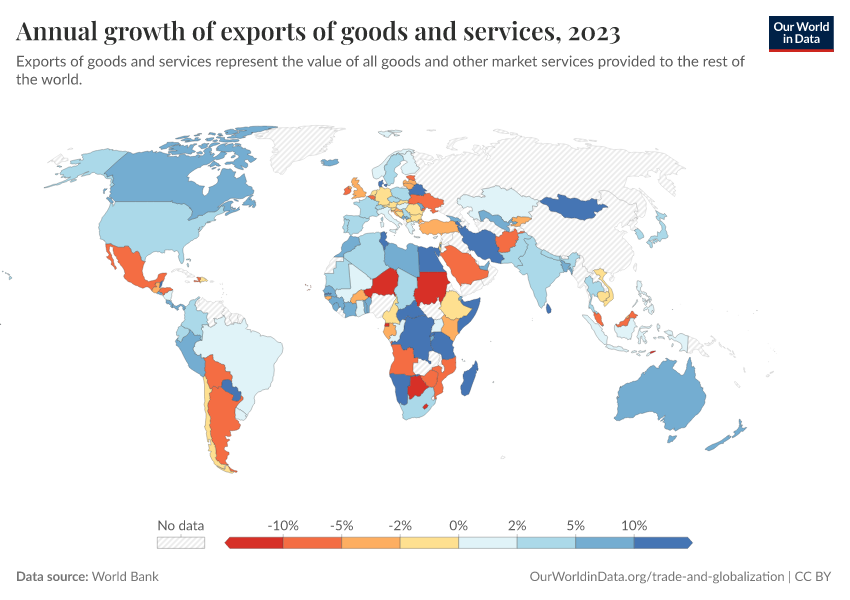 “Data Page: Annual growth of exports of goods and services”. Our World in Data (2026). Data adapted from World Bank. Retrieved from https://data-lexicalindex-indicators.owid.pages.dev:8789/20260130-180113/grapher/annual-growth-of-exports-of-goods-and-services.html [online resource] (archived on January 30, 2026).How to cite this data