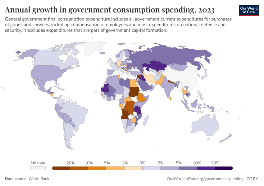 “Data Page: Annual growth in government consumption spending”. Our World in Data (2026). Data adapted from World Bank. Retrieved from https://data-lexicalindex-indicators.owid.pages.dev:8789/20260130-180113/grapher/annual-growth-of-general-government-final-consumption-expenditure.html [online resource] (archived on January 30, 2026).How to cite this data