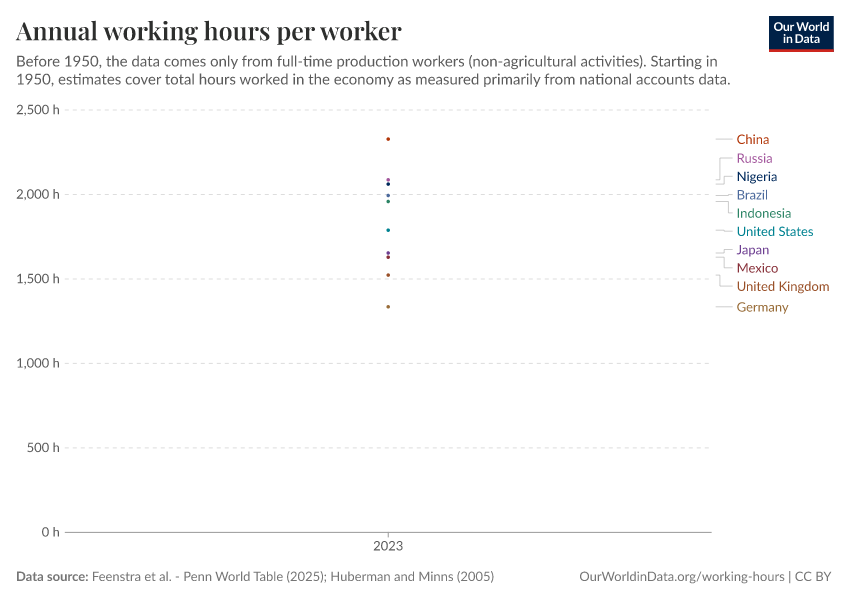 “Data Page: Annual working hours per worker”, part of the following publication: Charlie Giattino, Esteban Ortiz-Ospina, and Max Roser (2020) - “Working Hours”. Data adapted from Feenstra et al., Huberman and Minns. Retrieved from https://data-lexicalindex-indicators.owid.pages.dev:8789/20251013-111729/grapher/annual-working-hours-per-worker.html [online resource] (archived on October 13, 2025).How to cite this data