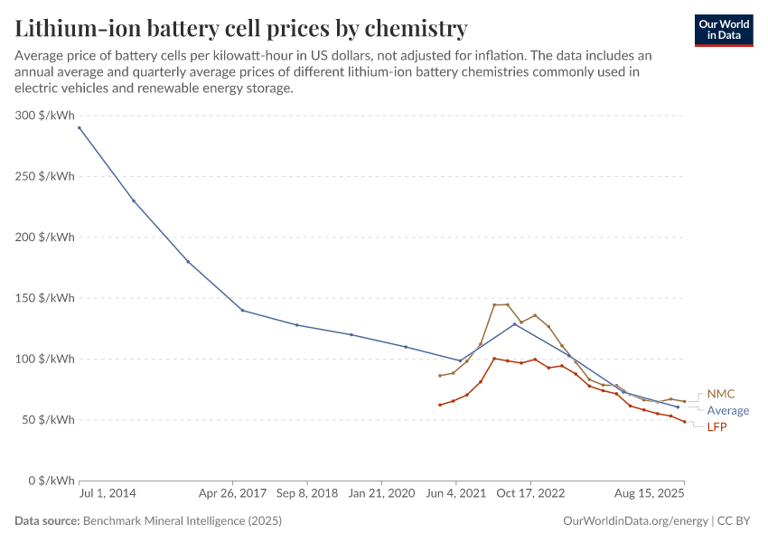 Benchmark Mineral Intelligence (2025) – with minor processing by Our World in Data. “Lithium-ion battery cell prices by chemistry” [dataset]. Benchmark Mineral Intelligence, “Lithium-ion battery prices”; Benchmark Mineral Intelligence, “Battery prices by chemistry” [original data]. Retrieved February 9, 2026 from https://data-lexicalindex-indicators.owid.pages.dev:8789/20260108-171008/grapher/average-battery-cell-price.html (archived on January 8, 2026).