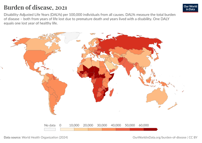 “Data Page: Burden of disease”, part of the following publication: Esteban Ortiz-Ospina and Max Roser (2016) - “Global Health”. Data adapted from World Health Organization. Retrieved from https://data-lexicalindex-indicators.owid.pages.dev:8789/20250909-093708/grapher/burden-of-disease-who.html [online resource] (archived on September 9, 2025).How to cite this data