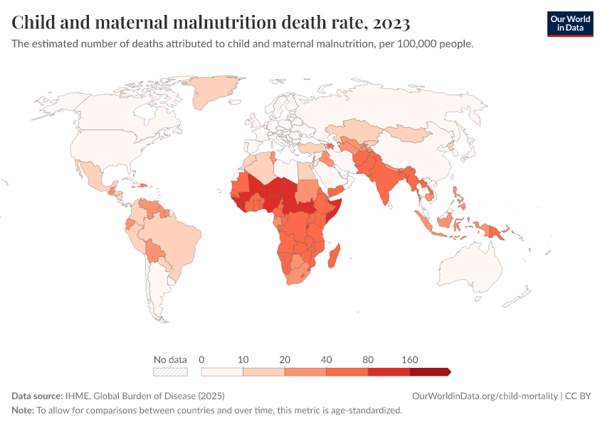 IHME, Global Burden of Disease (2024) – with minor processing by Our World in Data. “Child and maternal malnutrition death rate” [dataset]. IHME, Global Burden of Disease, “Global Burden of Disease - Risk Factors” [original data]. Retrieved February 9, 2026 from https://data-lexicalindex-indicators.owid.pages.dev:8789/20250909-093708/grapher/child-and-maternal-malnutrition-death-rate.html (archived on September 9, 2025).