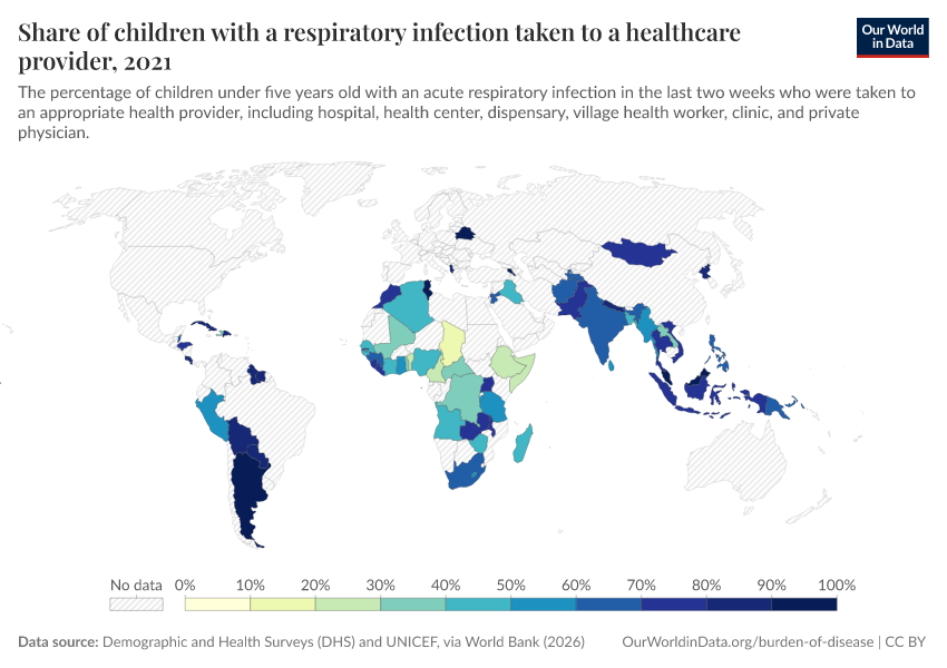 Demographic and Health Surveys (DHS) and UNICEF, via World Bank (2026) – processed by Our World in Data. “Share of children with a respiratory infection taken to a healthcare provider ” [dataset]. Demographic and Health Surveys (DHS) and UNICEF, via World Bank, “World Development Indicators 125” [original data]. Retrieved February 9, 2026 from https://data-lexicalindex-indicators.owid.pages.dev:8789/20260202-181317/grapher/children-treated-ari.html (archived on February 2, 2026).