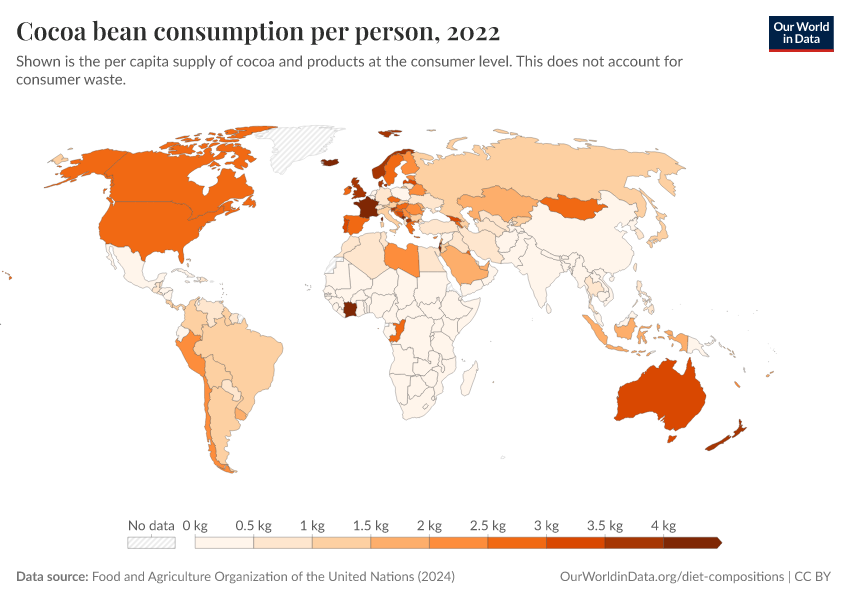 “Data Page: Yearly per capita supply of cocoa beans”. Our World in Data (2026). Data adapted from Food and Agriculture Organization of the United Nations. Retrieved from https://data-lexicalindex-indicators.owid.pages.dev:8789/20260116-144923/grapher/chocolate-consumption-per-person.html [online resource] (archived on January 16, 2026).How to cite this data