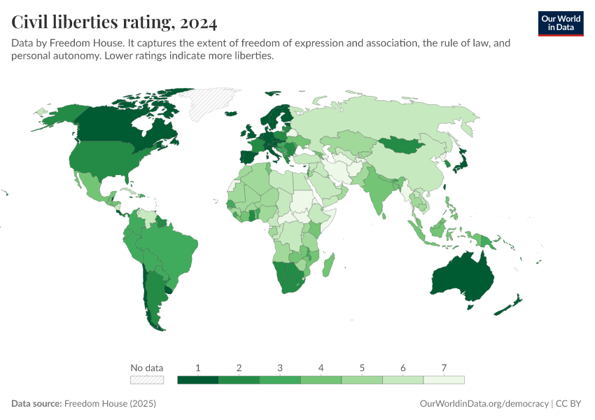 Freedom House (2025) – processed by Our World in Data. “Civil liberties rating” [dataset]. Freedom House, “Freedom in the World” [original data]. Retrieved February 9, 2026 from https://data-lexicalindex-indicators.owid.pages.dev:8789/20260119-070102/grapher/civil-liberties-rating-fh.html (archived on January 19, 2026).
