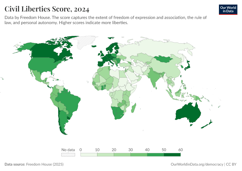Freedom House (2025) – processed by Our World in Data. “Civil Liberties Score” [dataset]. Freedom House, “Freedom in the World” [original data]. Retrieved February 9, 2026 from https://data-lexicalindex-indicators.owid.pages.dev:8789/20260204-170225/grapher/civil-liberties-score-fh.html (archived on February 4, 2026).