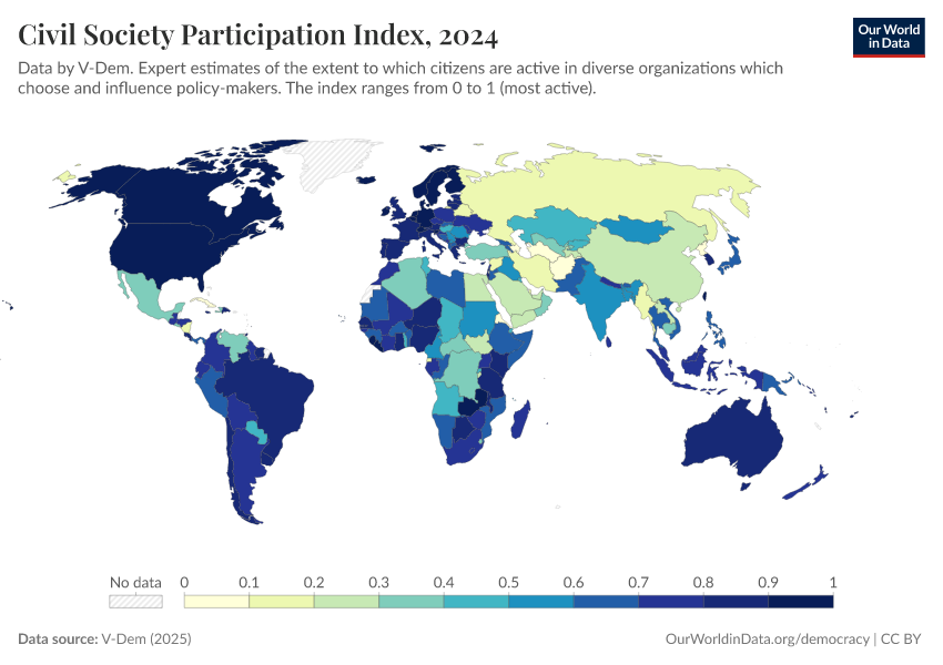 “Data Page: Civil society participation index”, part of the following publication: Bastian Herre, Lucas Rodés-Guirao, and Esteban Ortiz-Ospina (2013) - “Democracy”. Data adapted from V-Dem. Retrieved from https://data-lexicalindex-indicators.owid.pages.dev:8789/20260119-070102/grapher/civil-society-participation-index.html [online resource] (archived on January 19, 2026).How to cite this data