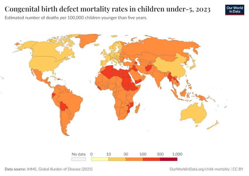 IHME, Global Burden of Disease (2024) – with minor processing by Our World in Data. “Congenital birth defect mortality rates in children under-5” [dataset]. IHME, Global Burden of Disease, “Global Burden of Disease - Deaths and DALYs” [original data]. Retrieved February 9, 2026 from https://data-lexicalindex-indicators.owid.pages.dev:8789/20250909-093708/grapher/congenital-birth-defect-mortality-rates-in-children-under-5.html (archived on September 9, 2025).