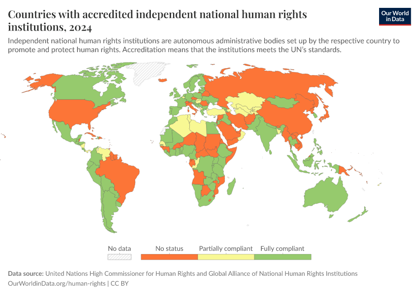 “Data Page: Countries with accredited independent national human rights institutions”. Our World in Data (2026). Data adapted from United Nations High Commissioner for Human Rights and Global Alliance of National Human Rights Institutions. Retrieved from https://data-lexicalindex-indicators.owid.pages.dev:8789/20251120-211038/grapher/countries-with-independent-national-human-rights-institution.html [online resource] (archived on November 20, 2025).How to cite this data
