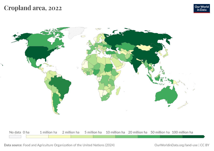 “Data Page: Cropland area”, part of the following publication: Hannah Ritchie, Pablo Rosado, and Max Roser (2023) - “Agricultural Production”. Data adapted from Food and Agriculture Organization of the United Nations. Retrieved from https://data-lexicalindex-indicators.owid.pages.dev:8789/20260119-235736/grapher/cropland-area.html [online resource] (archived on January 19, 2026).How to cite this data