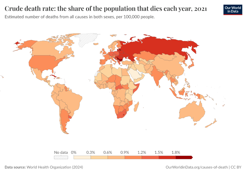 World Health Organization (2024) – with major processing by Our World in Data. “Crude death rate: the share of the population that dies each year” [dataset]. World Health Organization, “Global Health Estimates” [original data]. Retrieved February 9, 2026 from https://data-lexicalindex-indicators.owid.pages.dev:8789/20250909-093708/grapher/crude-death-rate-the-share-of-the-population-that-dies-each-year-who.html (archived on September 9, 2025).