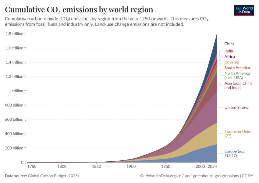 Global Carbon Budget (2025) – with major processing by Our World in Data. “Cumulative CO₂ emissions by world region” [dataset]. Global Carbon Project, “Global Carbon Budget v15” [original data]. Retrieved February 9, 2026 from https://data-lexicalindex-indicators.owid.pages.dev:8789/20260119-070102/grapher/cumulative-co2-emissions-region.html (archived on January 19, 2026).