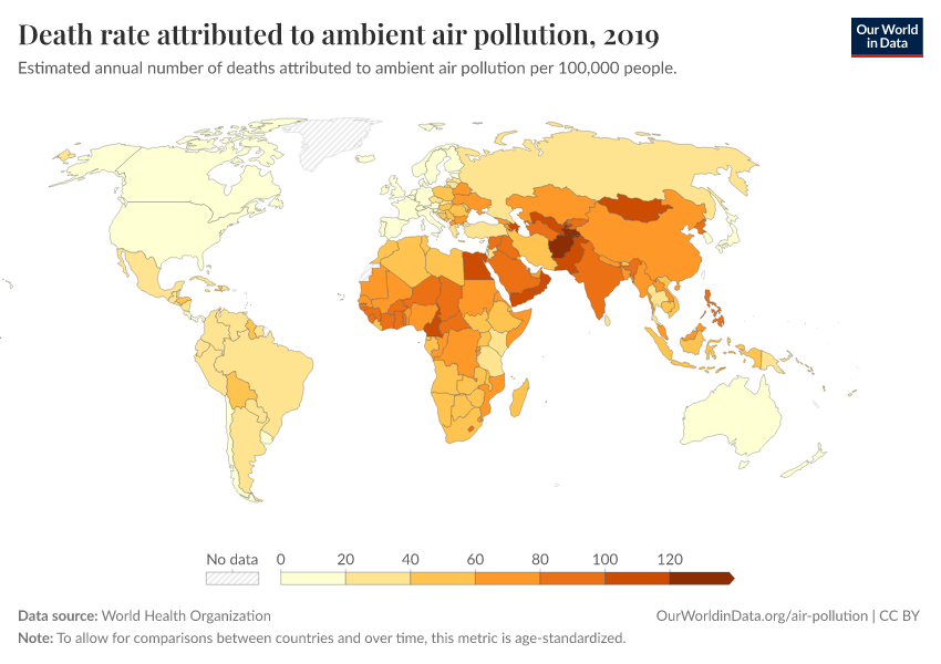 World Health Organization – processed by Our World in Data. “Death rate attributed to ambient air pollution” [dataset]. World Health Organization, “Global Health Observatory (GHO), World Health Organisation (WHO)” [original data]. Retrieved February 9, 2026 from https://data-lexicalindex-indicators.owid.pages.dev:8789/20260130-180113/grapher/death-rate-ambient-air-pollution.html (archived on January 30, 2026).