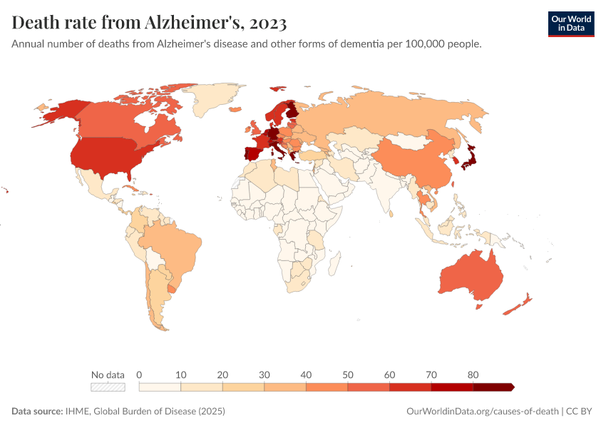 IHME, Global Burden of Disease (2024) – with minor processing by Our World in Data. “Death rate from Alzheimer's” [dataset]. IHME, Global Burden of Disease, “Global Burden of Disease - Deaths and DALYs” [original data]. Retrieved February 9, 2026 from https://data-lexicalindex-indicators.owid.pages.dev:8789/20250909-093708/grapher/death-rate-from-alzheimers-other-dementias-gbd.html (archived on September 9, 2025).