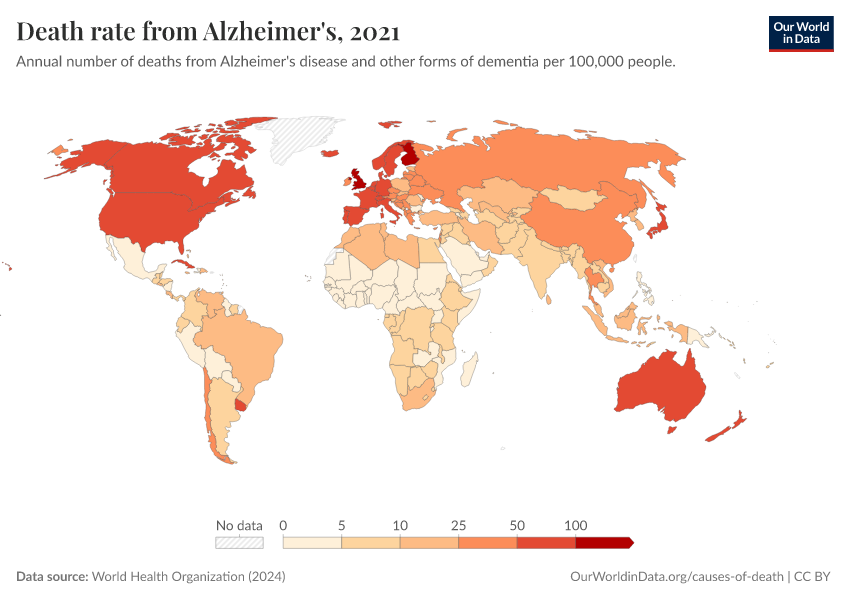 World Health Organization (2024) – with major processing by Our World in Data. “Death rate from Alzheimer's” [dataset]. World Health Organization, “Global Health Estimates” [original data]. Retrieved February 9, 2026 from https://data-lexicalindex-indicators.owid.pages.dev:8789/20250909-093708/grapher/death-rate-from-alzheimers-other-dementias-ghe.html (archived on September 9, 2025).