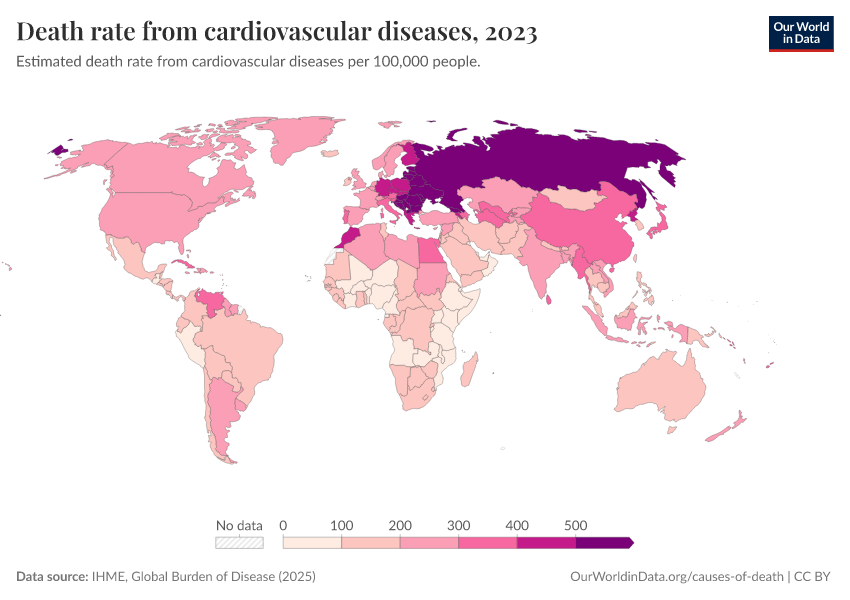 IHME, Global Burden of Disease (2024) – with minor processing by Our World in Data. “Death rate from cardiovascular diseases” [dataset]. IHME, Global Burden of Disease, “Global Burden of Disease - Deaths and DALYs” [original data]. Retrieved February 9, 2026 from https://data-lexicalindex-indicators.owid.pages.dev:8789/20250909-093708/grapher/death-rate-from-cardiovascular-diseases.html (archived on September 9, 2025).
