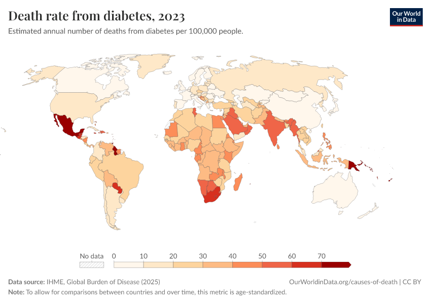 IHME, Global Burden of Disease (2024) – with minor processing by Our World in Data. “Death rate from diabetes” [dataset]. IHME, Global Burden of Disease, “Global Burden of Disease - Deaths and DALYs” [original data]. Retrieved February 9, 2026 from https://data-lexicalindex-indicators.owid.pages.dev:8789/20250909-093708/grapher/death-rate-from-diabetes.html (archived on September 9, 2025).