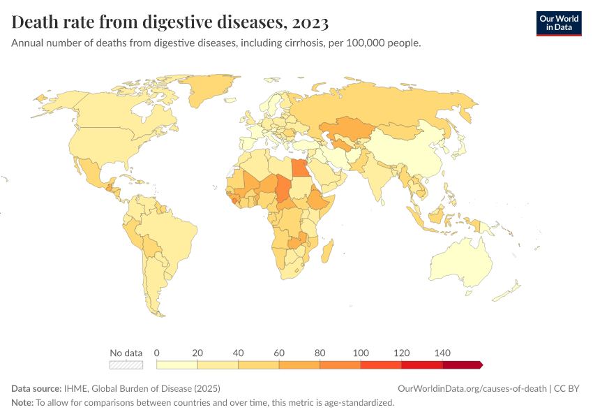 IHME, Global Burden of Disease (2024) – with minor processing by Our World in Data. “Death rate from digestive diseases” [dataset]. IHME, Global Burden of Disease, “Global Burden of Disease - Deaths and DALYs” [original data]. Retrieved February 9, 2026 from https://data-lexicalindex-indicators.owid.pages.dev:8789/20250909-093708/grapher/death-rate-from-digestive-diseases.html (archived on September 9, 2025).