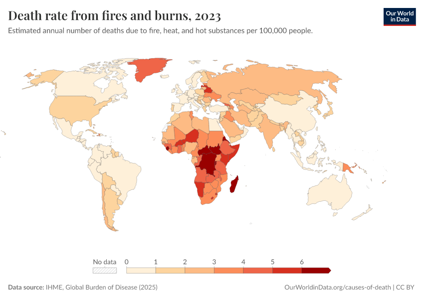 IHME, Global Burden of Disease (2024) – with minor processing by Our World in Data. “Death rate from fires and burns” [dataset]. IHME, Global Burden of Disease, “Global Burden of Disease - Deaths and DALYs” [original data]. Retrieved February 9, 2026 from https://data-lexicalindex-indicators.owid.pages.dev:8789/20250909-093708/grapher/death-rate-from-fires-and-burns-ihme.html (archived on September 9, 2025).