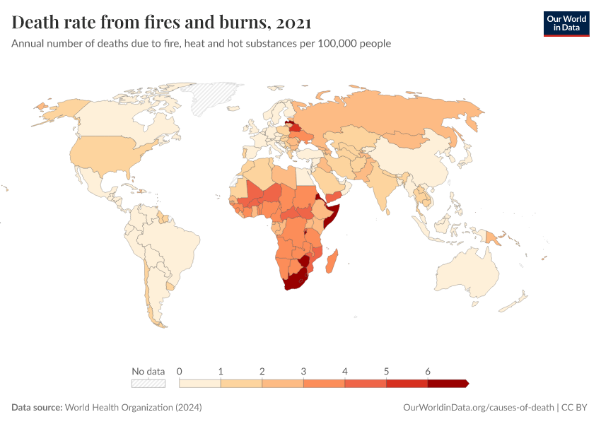 World Health Organization (2024) – with major processing by Our World in Data. “Death rate from fires and burns” [dataset]. World Health Organization, “Global Health Estimates” [original data]. Retrieved February 9, 2026 from https://data-lexicalindex-indicators.owid.pages.dev:8789/20250909-093708/grapher/death-rate-from-fires-and-burns-who.html (archived on September 9, 2025).