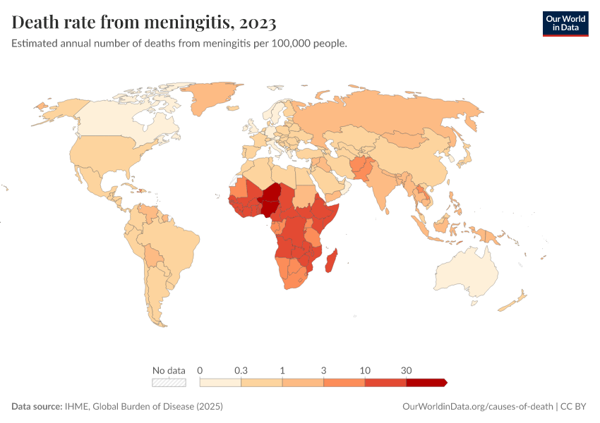 IHME, Global Burden of Disease (2024) – with minor processing by Our World in Data. “Death rate from meningitis” [dataset]. IHME, Global Burden of Disease, “Global Burden of Disease - Deaths and DALYs” [original data]. Retrieved February 9, 2026 from https://data-lexicalindex-indicators.owid.pages.dev:8789/20250909-093708/grapher/death-rate-from-meningitis-gbd.html (archived on September 9, 2025).