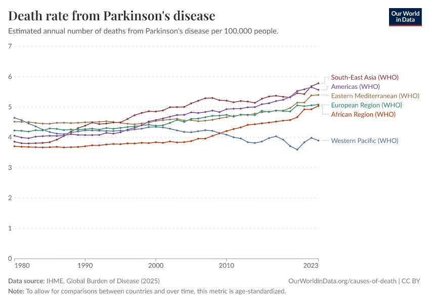 IHME, Global Burden of Disease (2024) – with minor processing by Our World in Data. “Death rate from Parkinson's disease” [dataset]. IHME, Global Burden of Disease, “Global Burden of Disease - Deaths and DALYs” [original data]. Retrieved February 9, 2026 from https://data-lexicalindex-indicators.owid.pages.dev:8789/20250909-093708/grapher/death-rate-from-parkinsons-disease.html (archived on September 9, 2025).