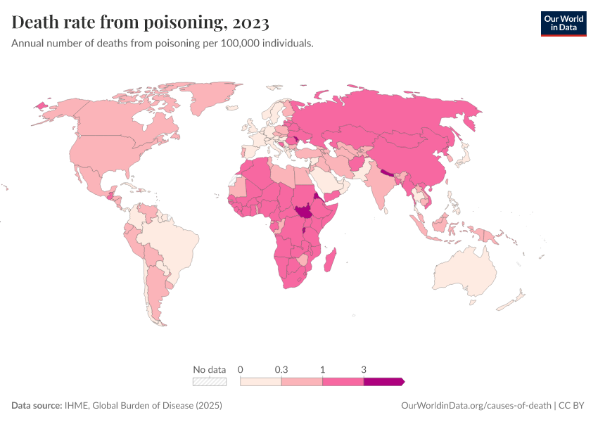 IHME, Global Burden of Disease (2024) – with minor processing by Our World in Data. “Death rate from poisoning” [dataset]. IHME, Global Burden of Disease, “Global Burden of Disease - Deaths and DALYs” [original data]. Retrieved February 9, 2026 from https://data-lexicalindex-indicators.owid.pages.dev:8789/20250909-093708/grapher/death-rate-from-poisoning-gbd.html (archived on September 9, 2025).