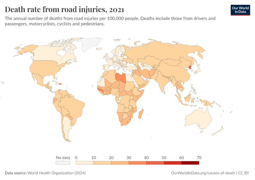 World Health Organization (2024) – with major processing by Our World in Data. “Death rate from road injuries” [dataset]. World Health Organization, “Global Health Estimates” [original data]. Retrieved February 9, 2026 from https://data-lexicalindex-indicators.owid.pages.dev:8789/20250909-093708/grapher/death-rate-from-road-accidents-ghe.html (archived on September 9, 2025).