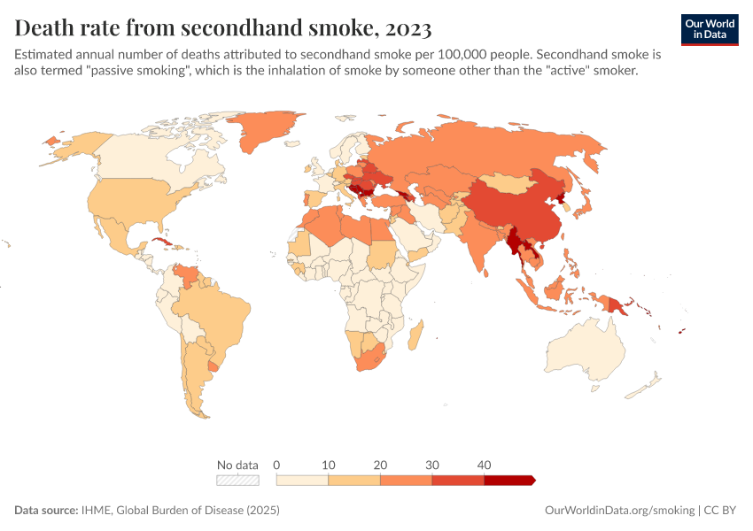 IHME, Global Burden of Disease (2024) – with minor processing by Our World in Data. “Death rate from secondhand smoke” [dataset]. IHME, Global Burden of Disease, “Global Burden of Disease - Risk Factors” [original data]. Retrieved February 9, 2026 from https://data-lexicalindex-indicators.owid.pages.dev:8789/20250909-093708/grapher/death-rate-from-secondhand-smoke-gbd.html (archived on September 9, 2025).
