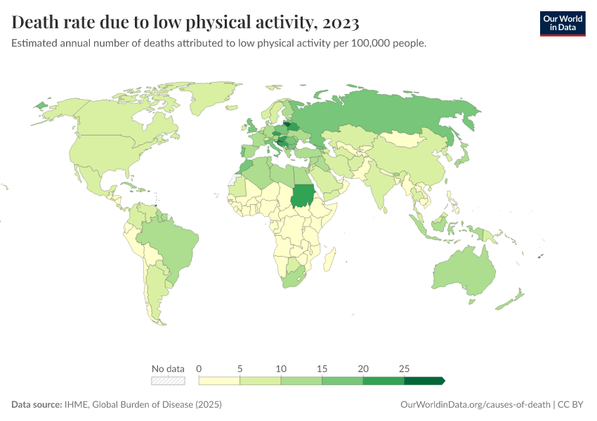 “Data Page: Death rate due to low physical activity”, part of the following publication: Esteban Ortiz-Ospina and Max Roser (2016) - “Global Health”. Data adapted from IHME, Global Burden of Disease. Retrieved from https://data-lexicalindex-indicators.owid.pages.dev:8789/20250909-093708/grapher/death-rates-due-to-low-physical-activity-gbd.html [online resource] (archived on September 9, 2025).How to cite this data