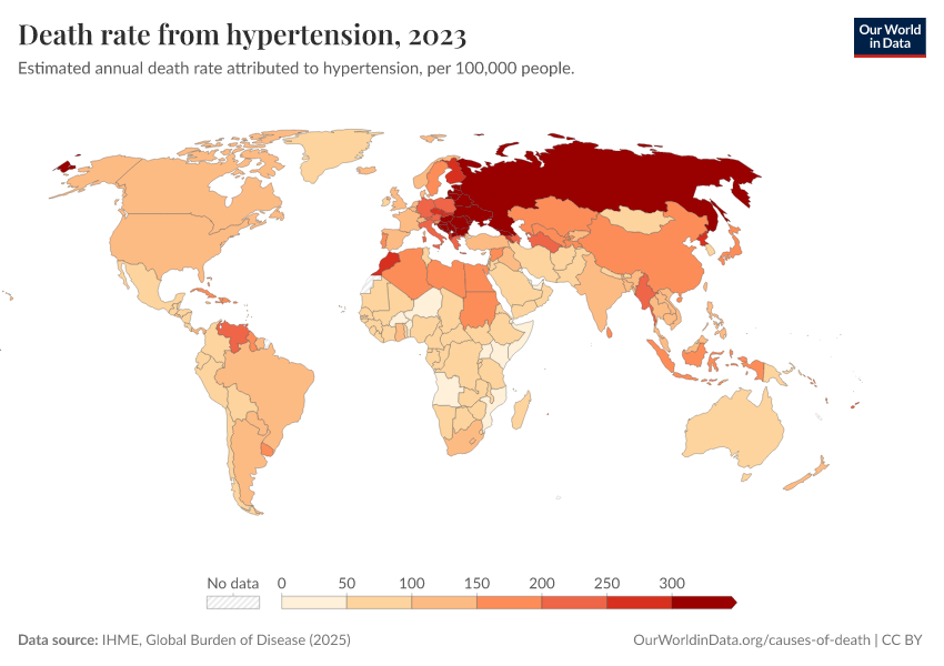 IHME, Global Burden of Disease (2024) – with minor processing by Our World in Data. “Death rate from hypertension” [dataset]. IHME, Global Burden of Disease, “Global Burden of Disease - Risk Factors” [original data]. Retrieved February 9, 2026 from https://data-lexicalindex-indicators.owid.pages.dev:8789/20250909-093708/grapher/death-rates-from-high-blood-pressure-gbd.html (archived on September 9, 2025).