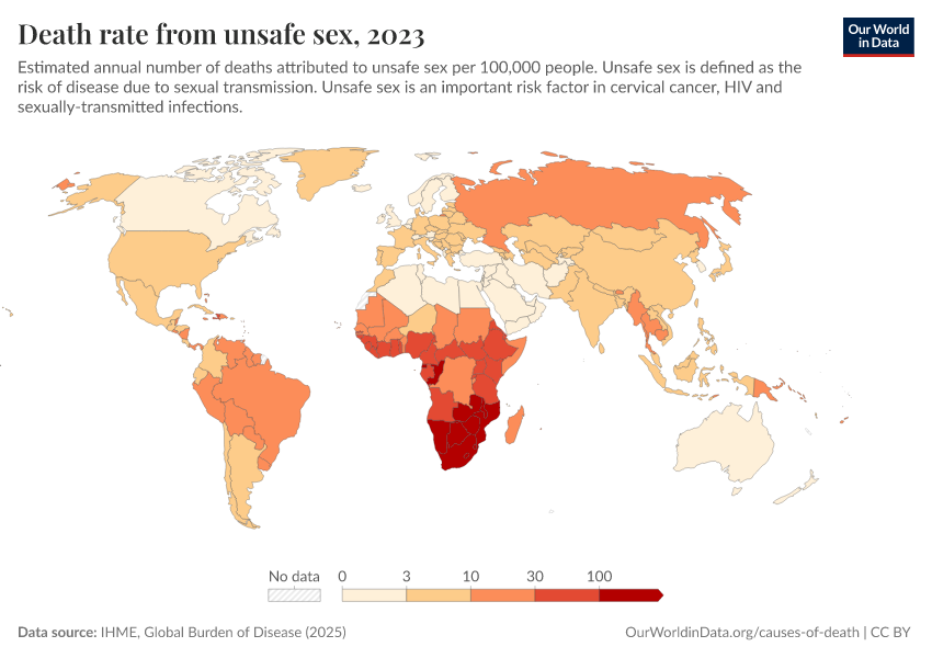IHME, Global Burden of Disease (2024) – with minor processing by Our World in Data. “Death rate from unsafe sex” [dataset]. IHME, Global Burden of Disease, “Global Burden of Disease - Risk Factors” [original data]. Retrieved February 9, 2026 from https://data-lexicalindex-indicators.owid.pages.dev:8789/20250909-093708/grapher/death-rates-from-unsafe-sex-gbd.html (archived on September 9, 2025).