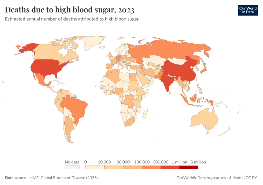IHME, Global Burden of Disease (2024) – with minor processing by Our World in Data. “Deaths due to high blood sugar” [dataset]. IHME, Global Burden of Disease, “Global Burden of Disease - Risk Factors” [original data]. Retrieved February 9, 2026 from https://data-lexicalindex-indicators.owid.pages.dev:8789/20250909-093708/grapher/deaths-due-to-high-blood-sugar.html (archived on September 9, 2025).